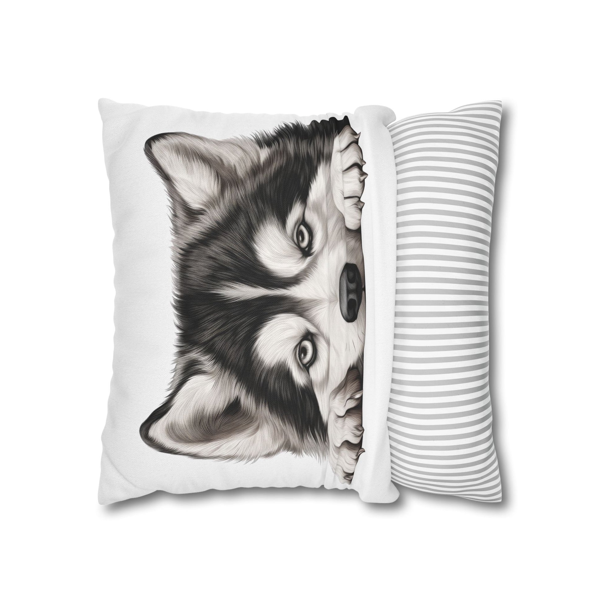 Soft, square pillow cover with a soulful husky portrait that looks like it’s peeking right at you. The spun polyester fabric keeps the print crisp and wrinkle-free, while the double-sided image wraps the whole cushion in gentle monochrome tones. A concealed beige zipper keeps edges clean and lets the artwork sit uninterrupted. Slip this cover over your own insert to add a quiet, cozy accent — whether it’s layered on a reading chair, leaning against cabin-planter wood, or tucked into a pet-lover’s nook. The husky’s big eyes and pawing pose bring warmth and companionship to low-light evenings and lazy weekends.