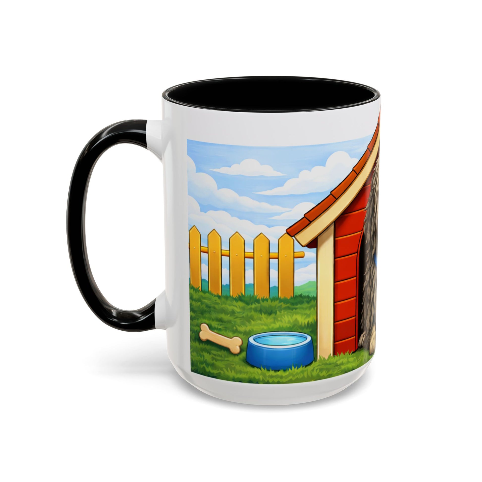 Warm morning light, a wagging tail, and the comforting weight of a favorite mug in your hands. This ceramic coffee mug brings that cozy, backyard scene to your kitchen — a happy, shaggy dog lounging by a red doghouse with a sunny picket-fence yard wrapping around the cup. The vivid colors and glossy finish make each sip feel a little more cheerful. Durable and everyday-friendly, it stands up to microwave reheats and dishwasher cycles while keeping the playful artwork bright.