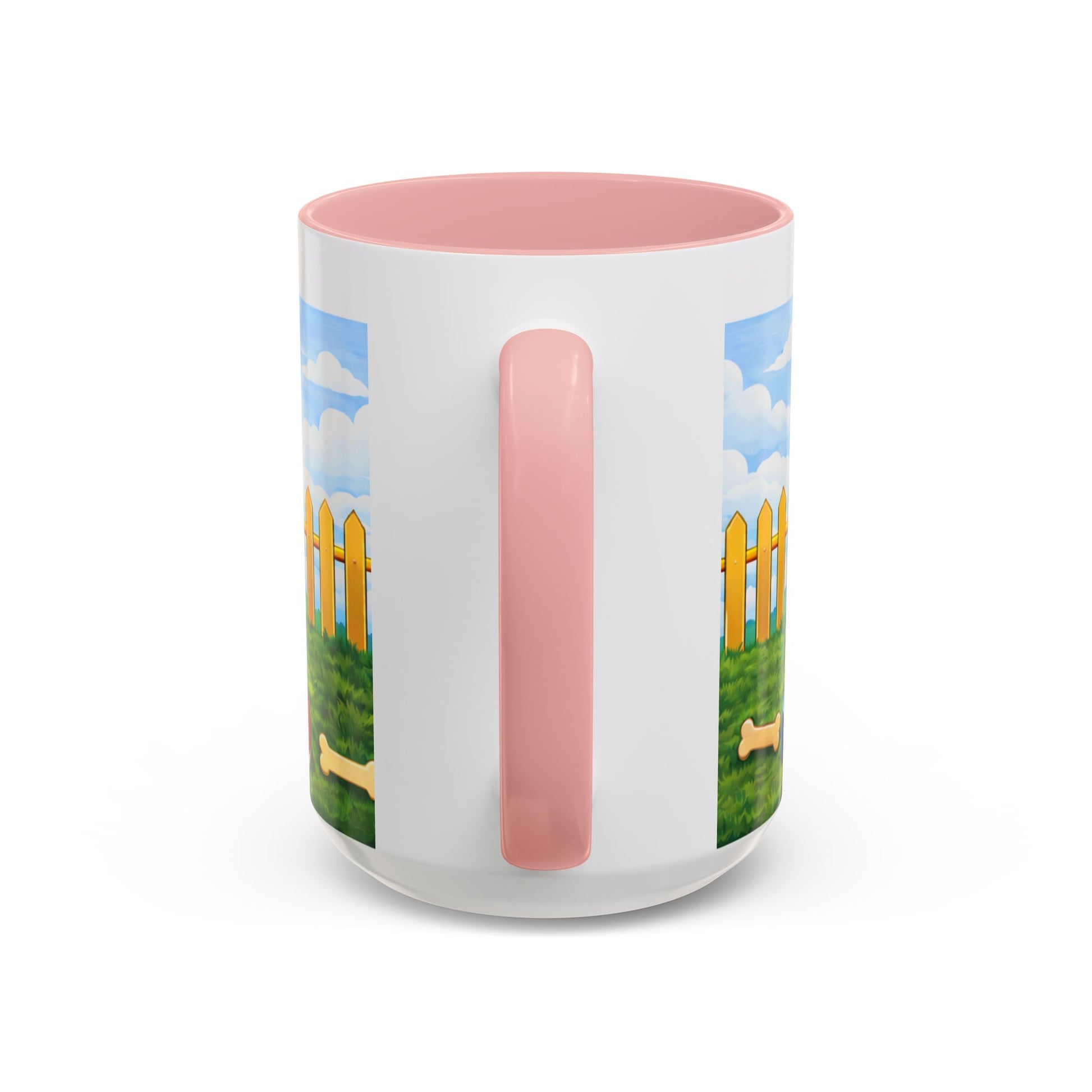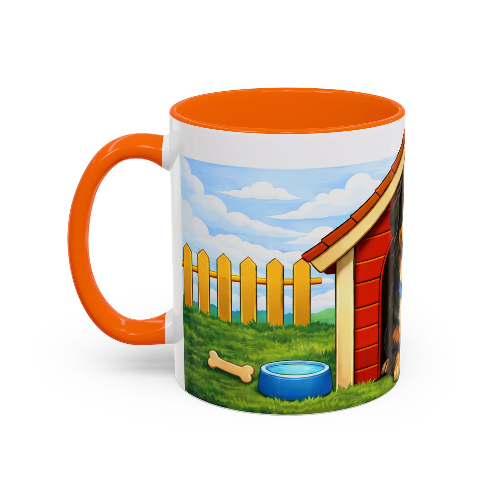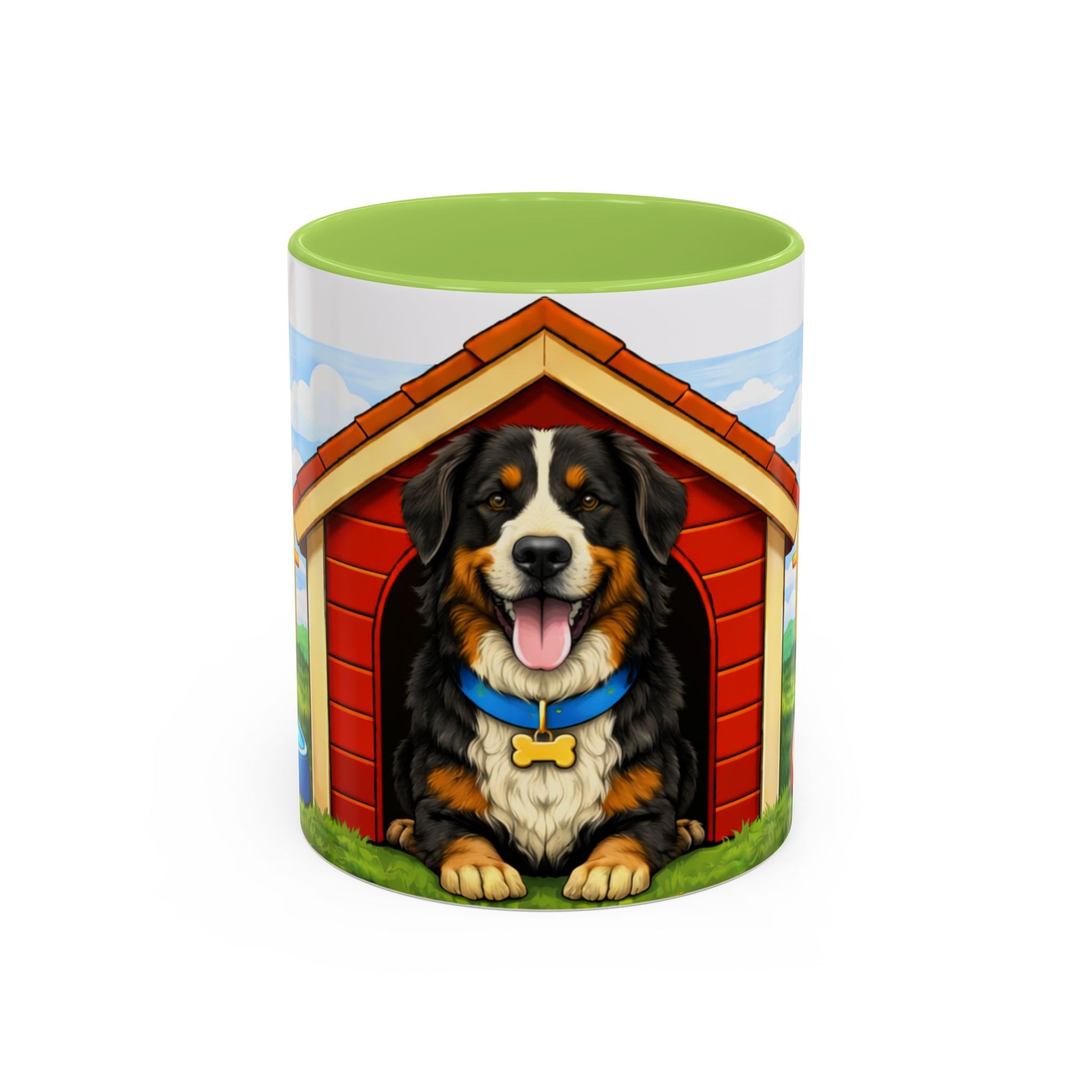 Warmth in your hands and a wag in your heart. This ceramic mug features a cheerful Bernese mountain dog framed by a bright red doghouse, green yard and picket fence — a little slice of backyard sunshine for mornings, breaks, and slow evenings. The glossy, high-contrast print brings every playful detail to life: the dog’s friendly eyes, the bone and ball at his paws, and the clear blue sky above. Offered in two sizes with a colored interior and handle, it’s built to withstand everyday use while keeping the artwork vivid. Sip coffee, tea, or cocoa and feel like you’ve stepped into an afternoon with a loyal pup.