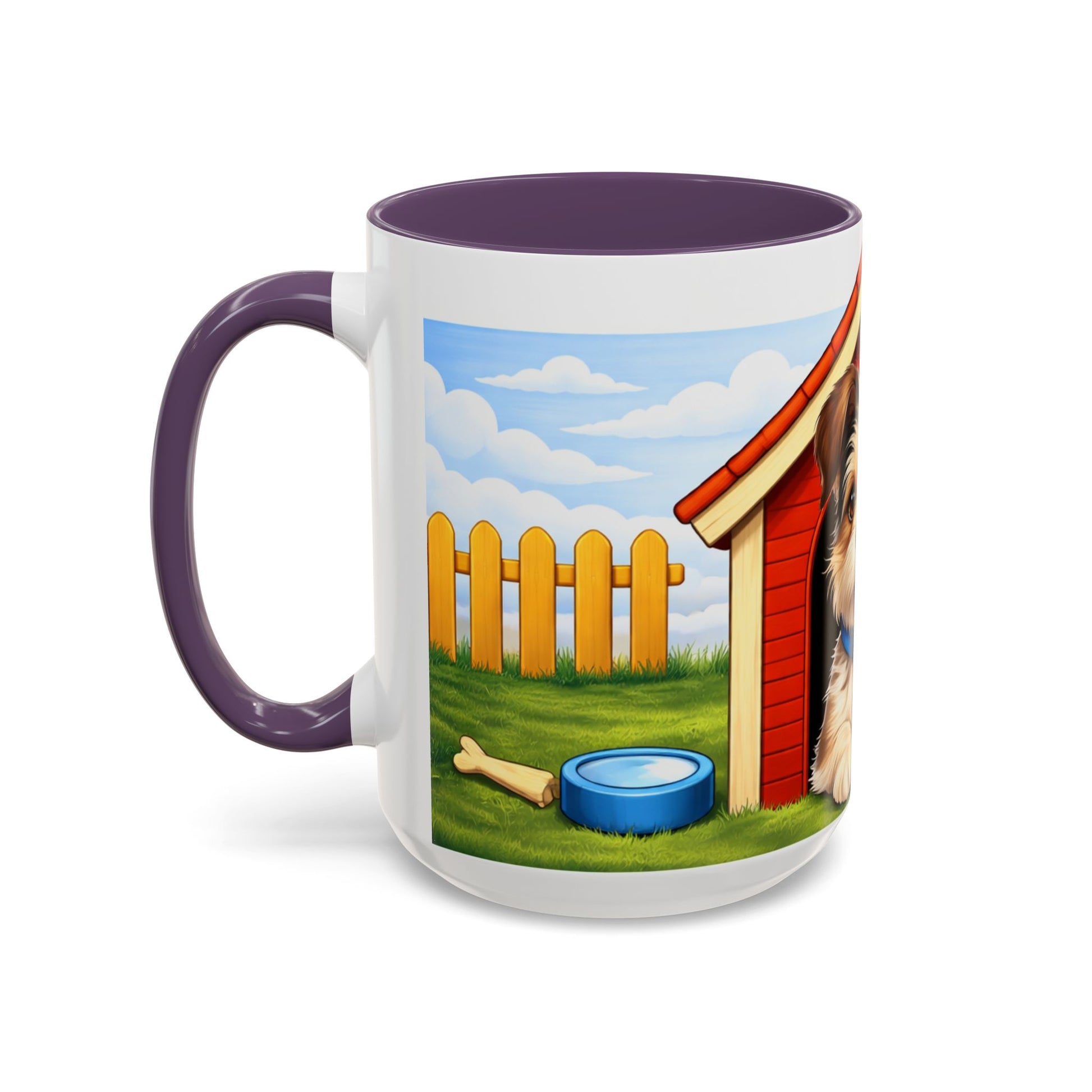 Warm, playful, and bright — this ceramic coffee mug brings a little backyard sunshine to your morning ritual. A cheerful pup peeks from a red doghouse against a picket-fence sky, making each sip feel like a pause on a slow weekend with your furry friend. The colored interior and handle add a pop that complements the scene and lifts your coffee break into something genuinely joyful. Durable glossy ceramic holds up to daily use, while vibrant printing keeps the colors crisp cup after cup. Let this mug sit on your kitchen counter, desk, or bedside table and remind you of simple comforts: wagging tails, cool grass, and a quiet backyard afternoon.
