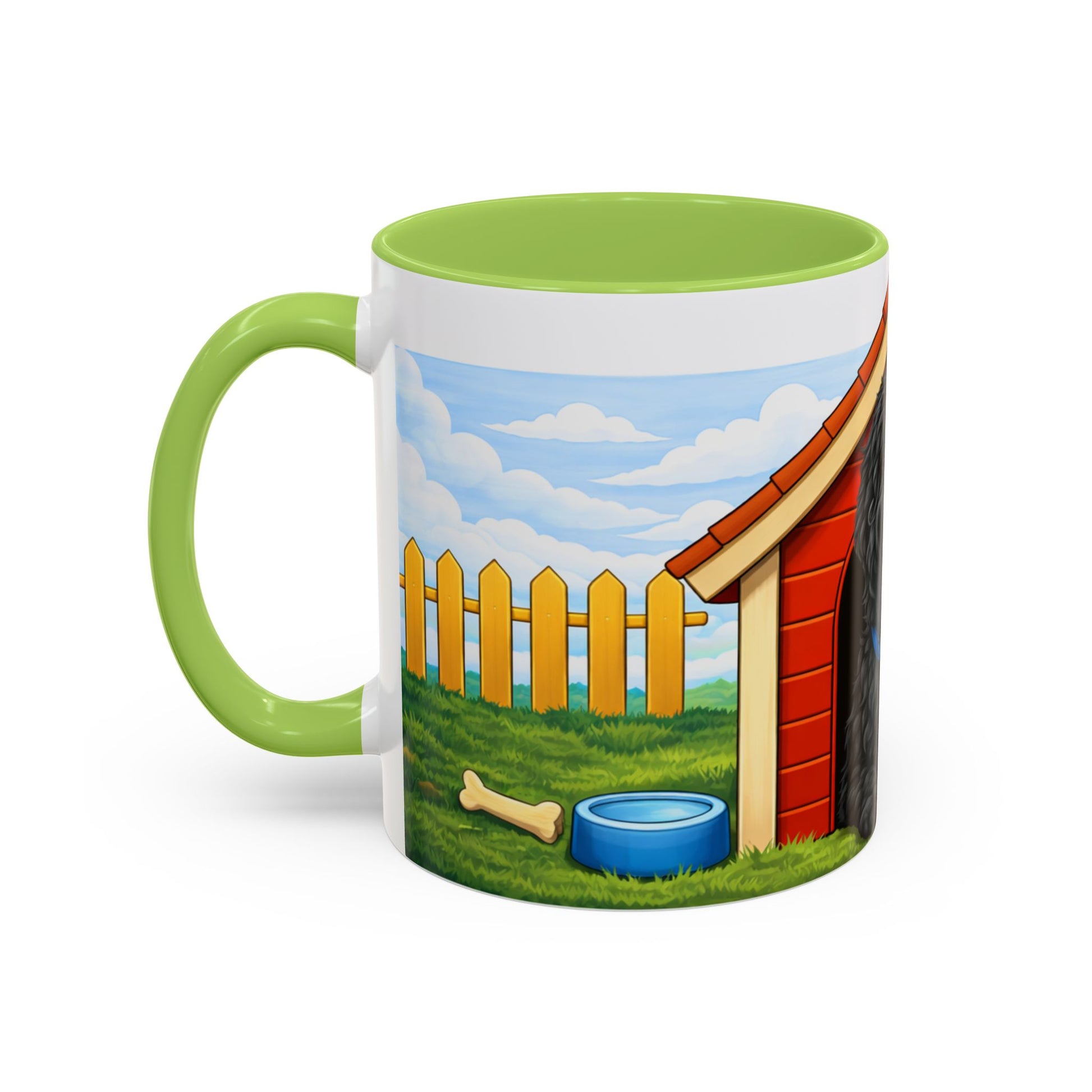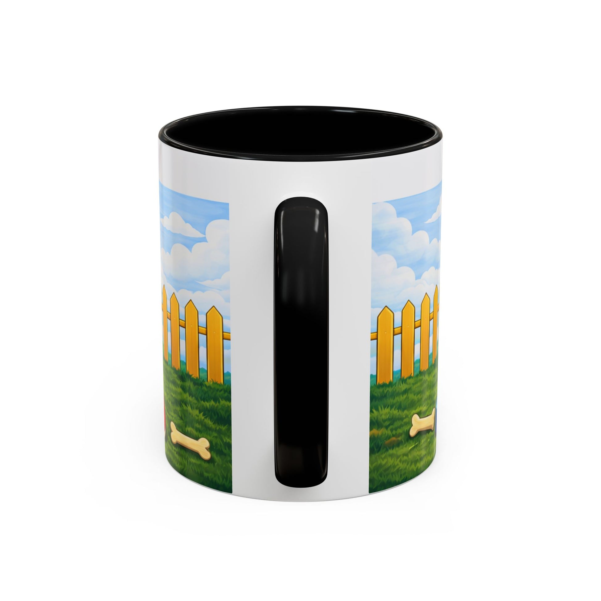 A warm, playful ceramic mug that brings a bit of backyard joy to your morning routine. A fluffy black dog lounges at the entrance of a bright red doghouse, tongue out, surrounded by a sunny yard, a bone, and a paw-print ball—an illustration that feels like a happy visit from a loyal companion. The colored interior and handle add a cheerful contrast against the glossy white exterior, making each sip feel a little brighter. This mug suits quiet mornings with a pet, cozy afternoons by the window, or casual coffee breaks when you want a small, familiar smile.
