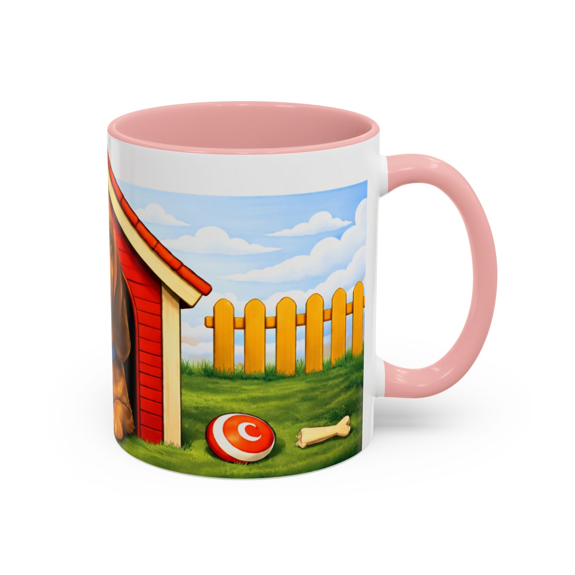 Bright mornings start here. This ceramic mug wraps a cheerful backyard scene around a glossy black rim: a happy brown pup lounging at the entrance of a red doghouse, a sunlit lawn with a picket fence, and scattered toys that hint at slow weekend playtime. It feels warm and familiar — like a neighbor waving through the fence or the first sip that settles you into the day. Hardworking, dishwasher- and microwave-safe, the mug’s vibrant print and contrasting interior give everyday coffee, tea, or cocoa a bit of joy. It fits into quiet routines and lively mornings alike, bringing a small, steady smile to dog lovers, pet parents, and anyone who keeps a bit of homey comfort in their kitchen or office.