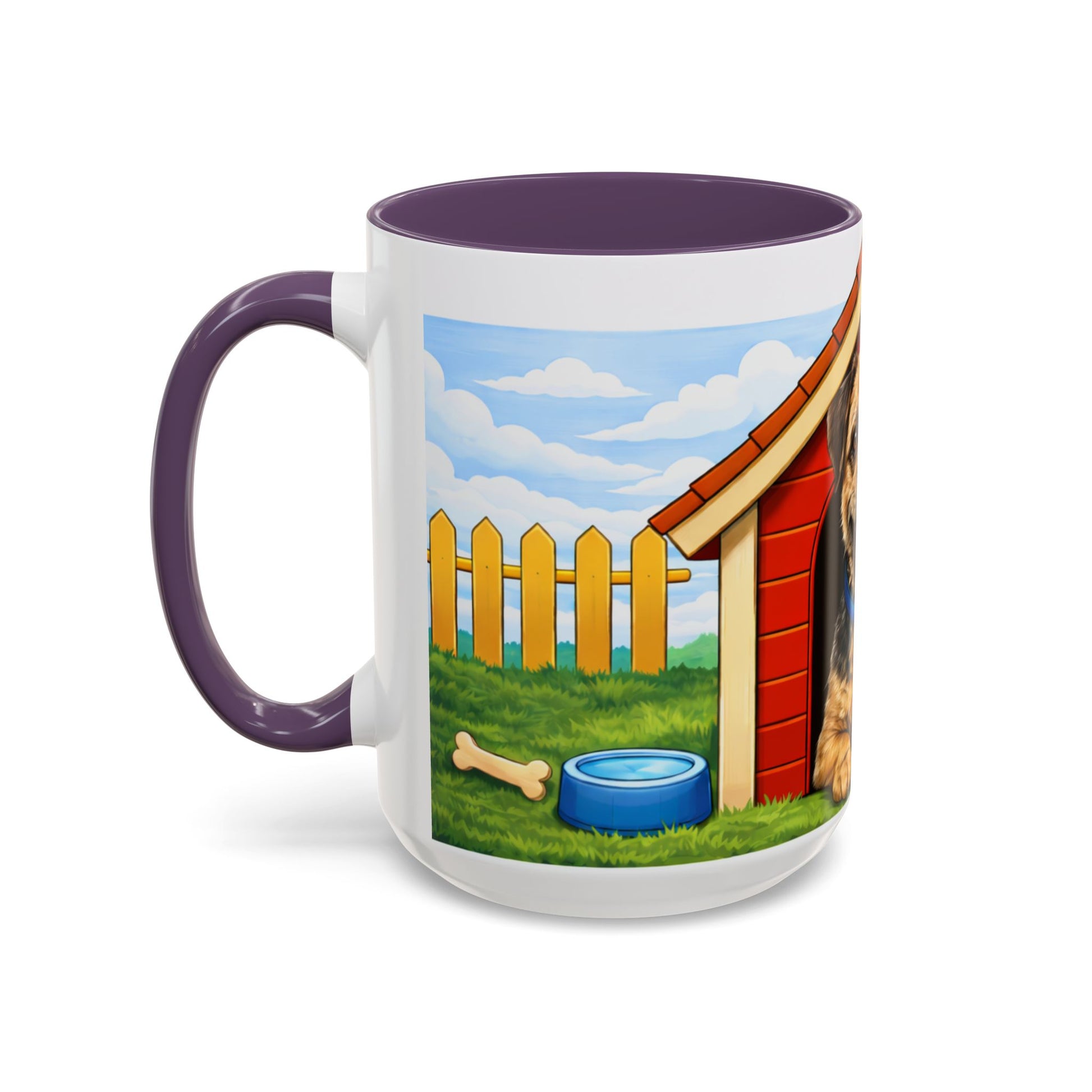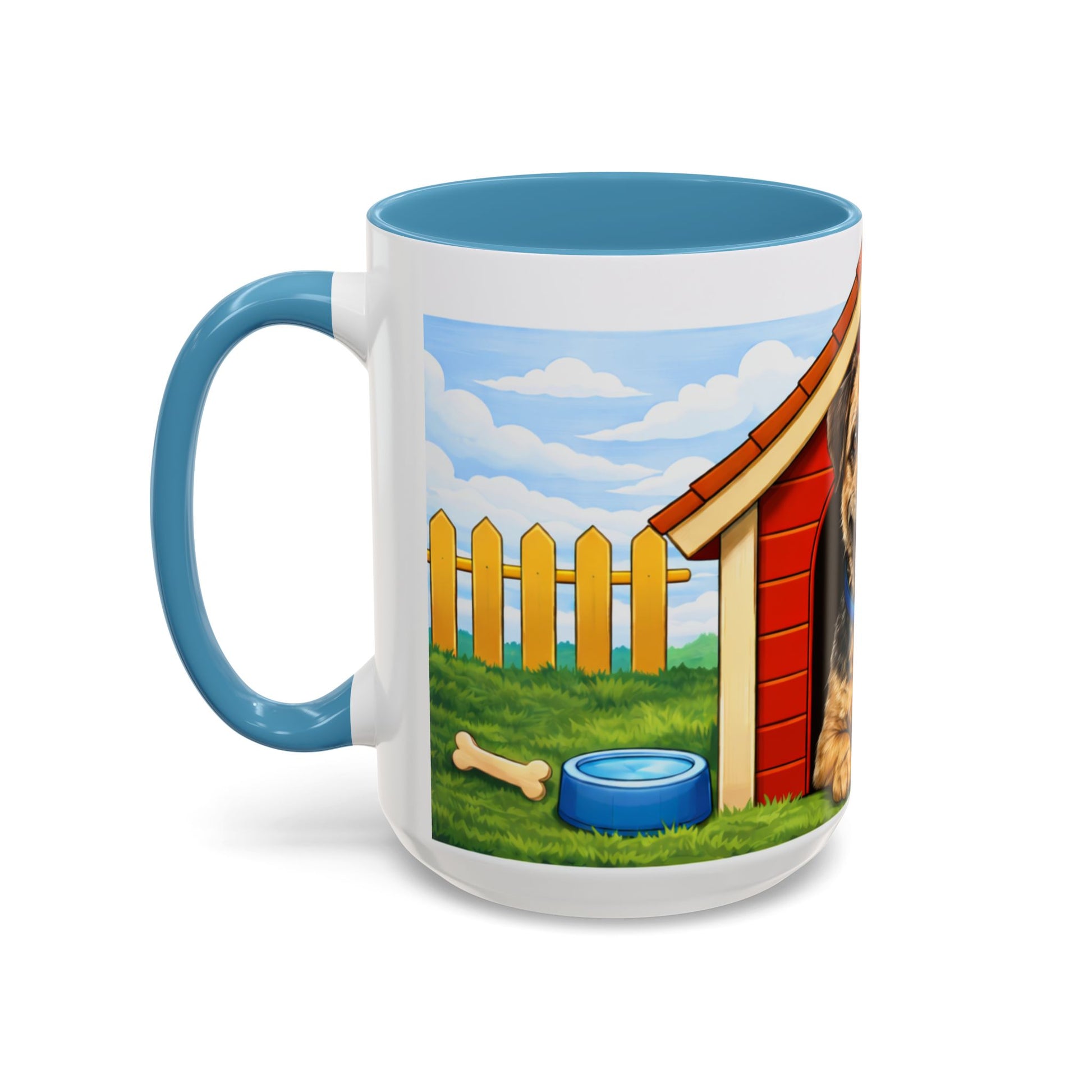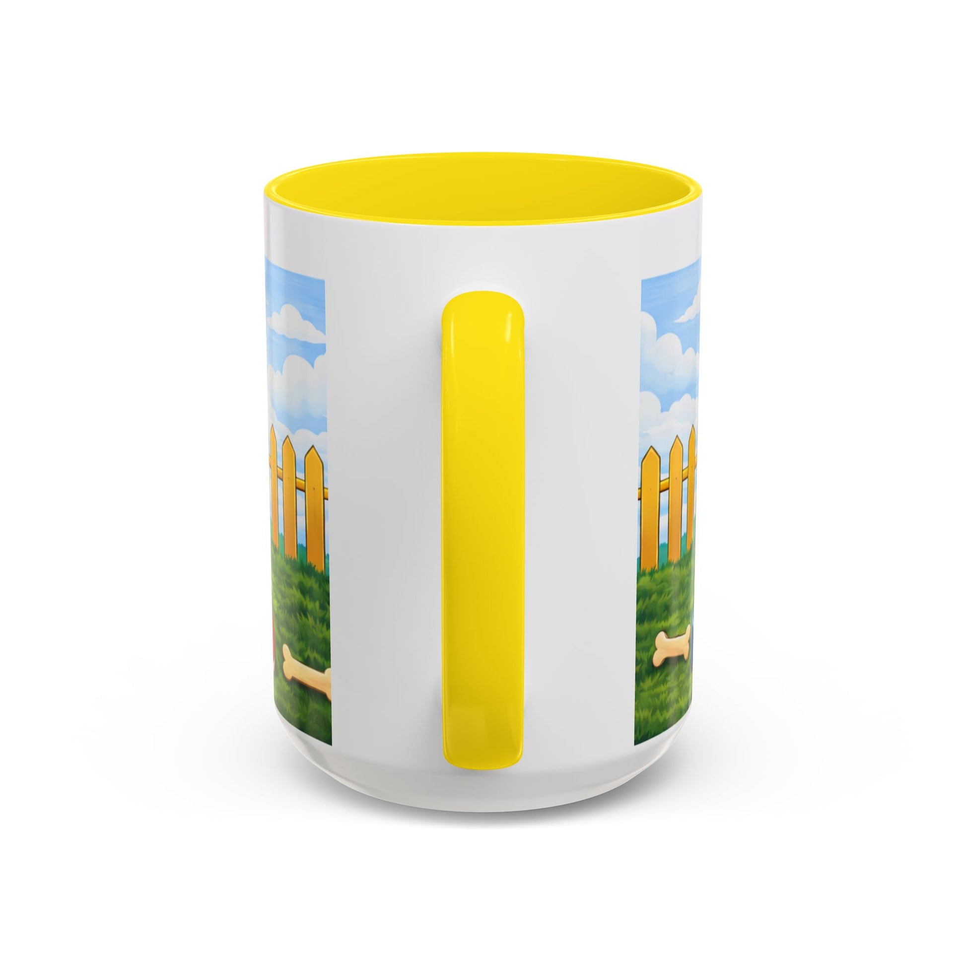 This glossy ceramic mug brings a warm, playful energy to your morning routine. Bright, crisp printing wraps a cheerful scene around the cup: a happy dog lounging at the mouth of a red doghouse, sunlit yard with a picket fence, and playful details like a ball and bone. The colored interior and handle add a bold contrast that makes the illustration pop while the sturdy C-shaped handle feels comfortable in your hand. Use it for coffee, tea, or cocoa when you want a small, silly moment of comfort and a reminder of wagging tails and backyard afternoons.