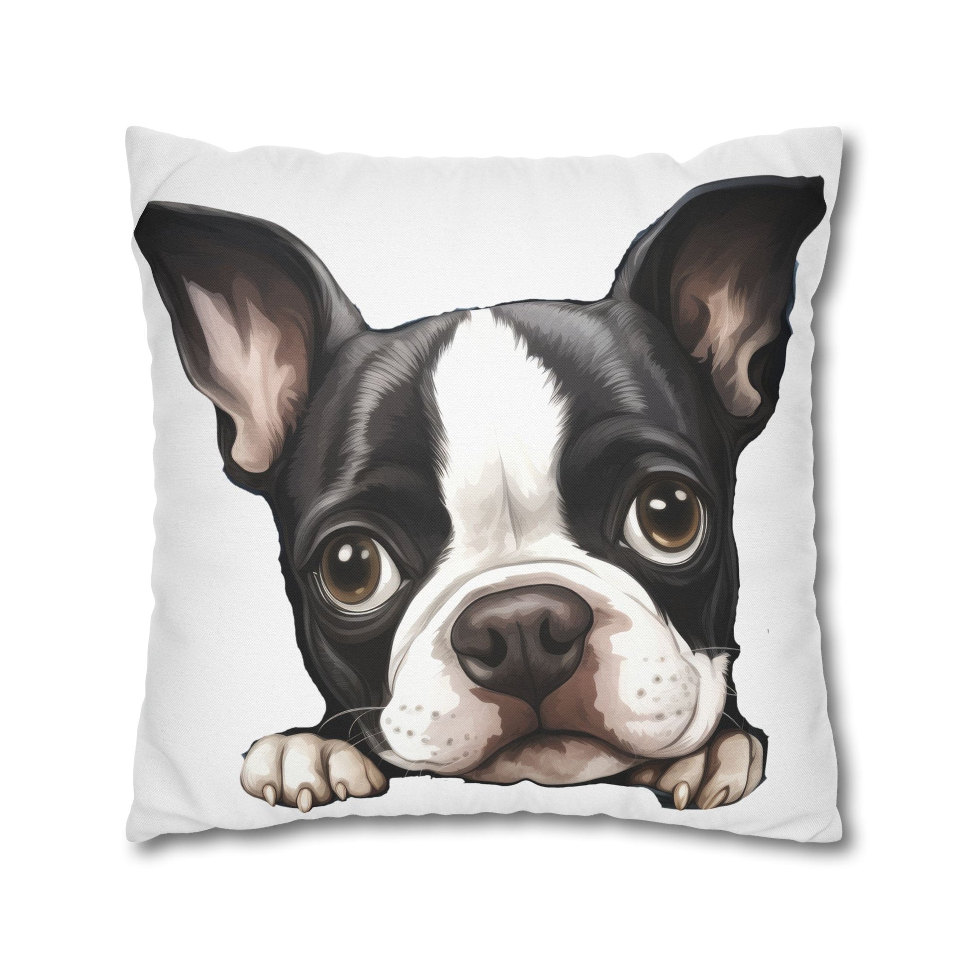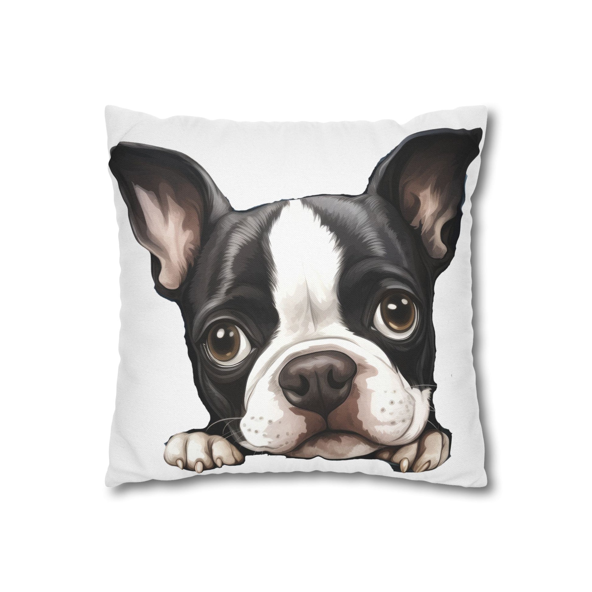 Bring a playful, heartwarming vibe to any cozy corner with this double-sided spun polyester square pillowcase. Soft to the touch and resilient in shape, the cover showcases a wide-eyed Boston Terrier illustration that peeks over the edge — a little moment of joy that brightens sofas, reading nooks, and dog-lover bedrooms. The concealed beige zipper keeps the look clean while allowing easy removal for washing. Lightweight and low-maintenance, this pillowcase keeps its crisp appearance without ironing, so your space stays effortlessly welcoming.