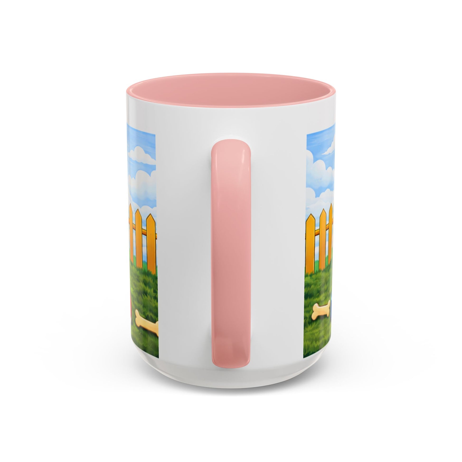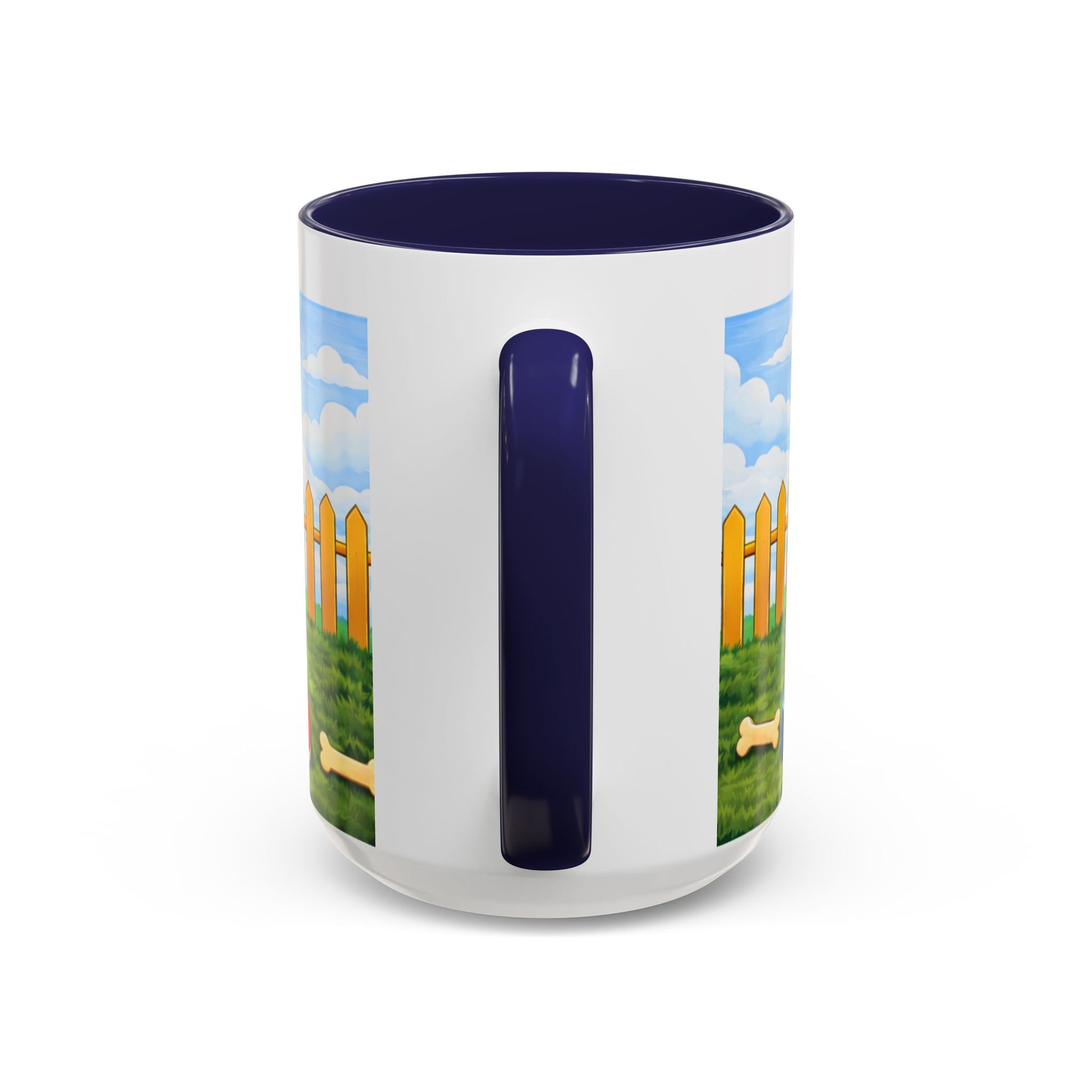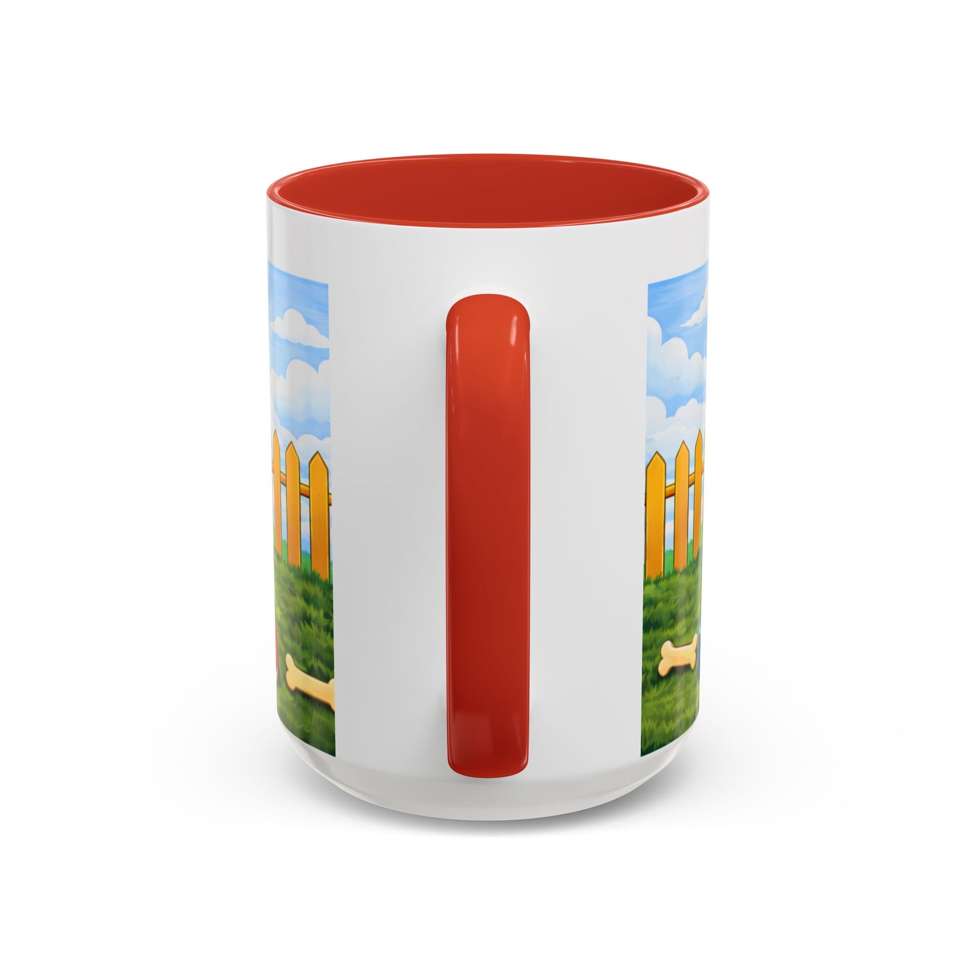 Morning light spills across the yard. A happy pup lounges at the mouth of a bright red doghouse, tongue out and tail wagging — the kind of grin that makes you breathe easier. This ceramic mug brings that small, steady joy to your coffee ritual. The glossy contrast rim and handle frame the scene like a little window to a sunny afternoon: picket fence, blue sky, and a bone waiting in the grass.