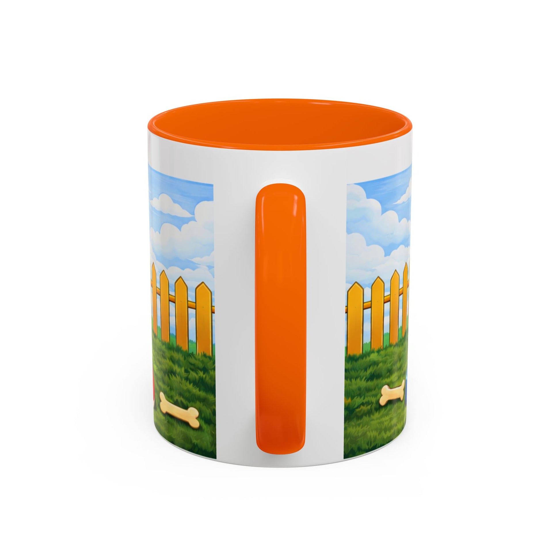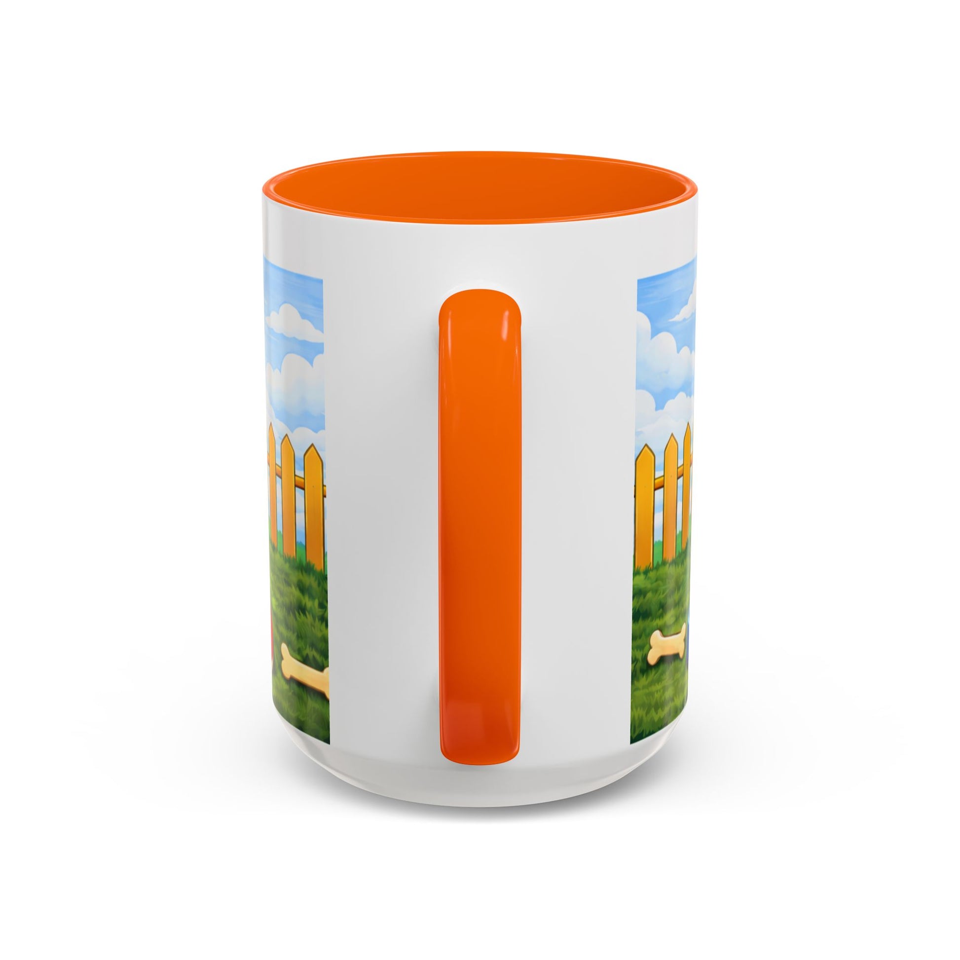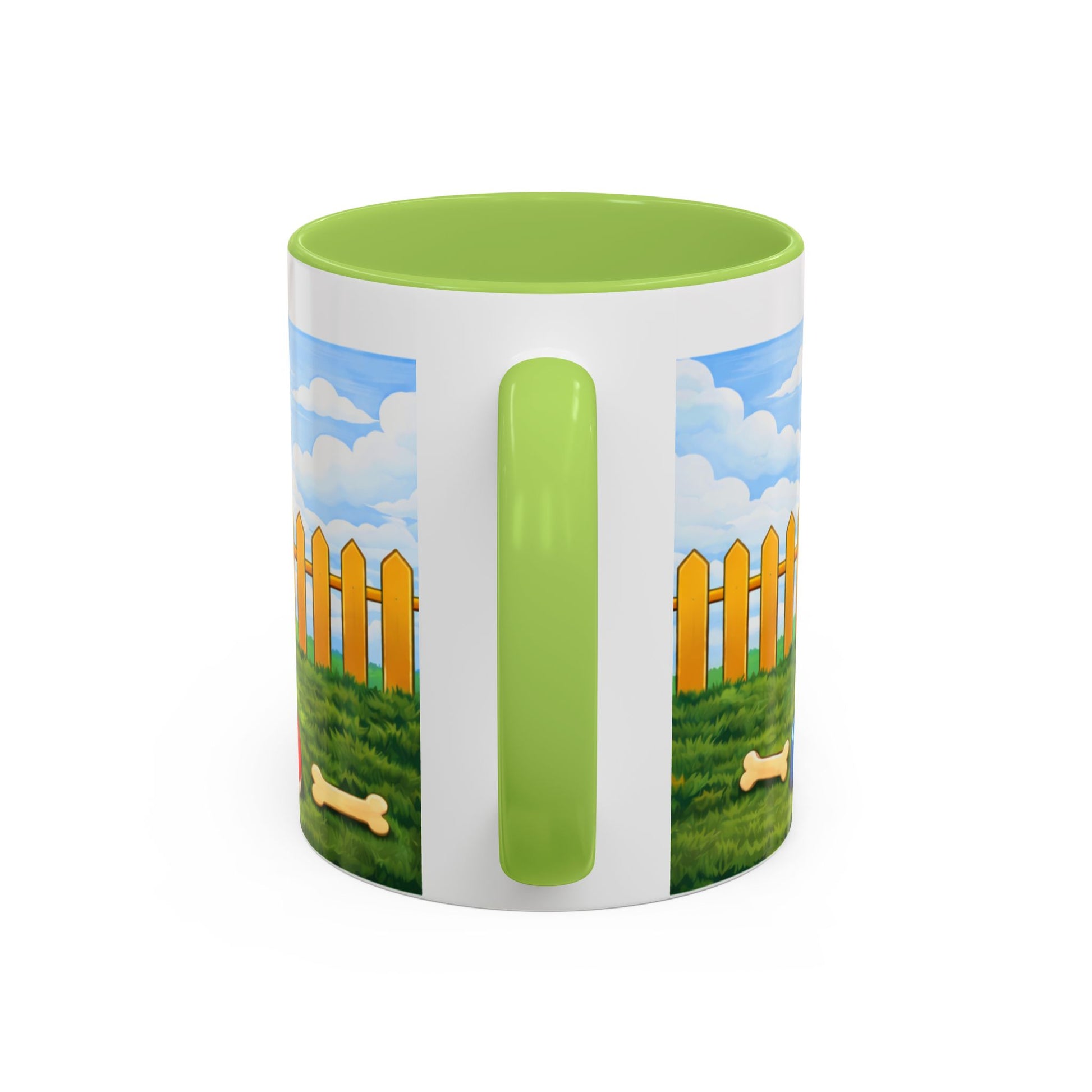 Morning light spills across the yard. A happy pup lounges at the mouth of a bright red doghouse, tongue out and tail wagging — the kind of grin that makes you breathe easier. This ceramic mug brings that small, steady joy to your coffee ritual. The glossy contrast rim and handle frame the scene like a little window to a sunny afternoon: picket fence, blue sky, and a bone waiting in the grass.