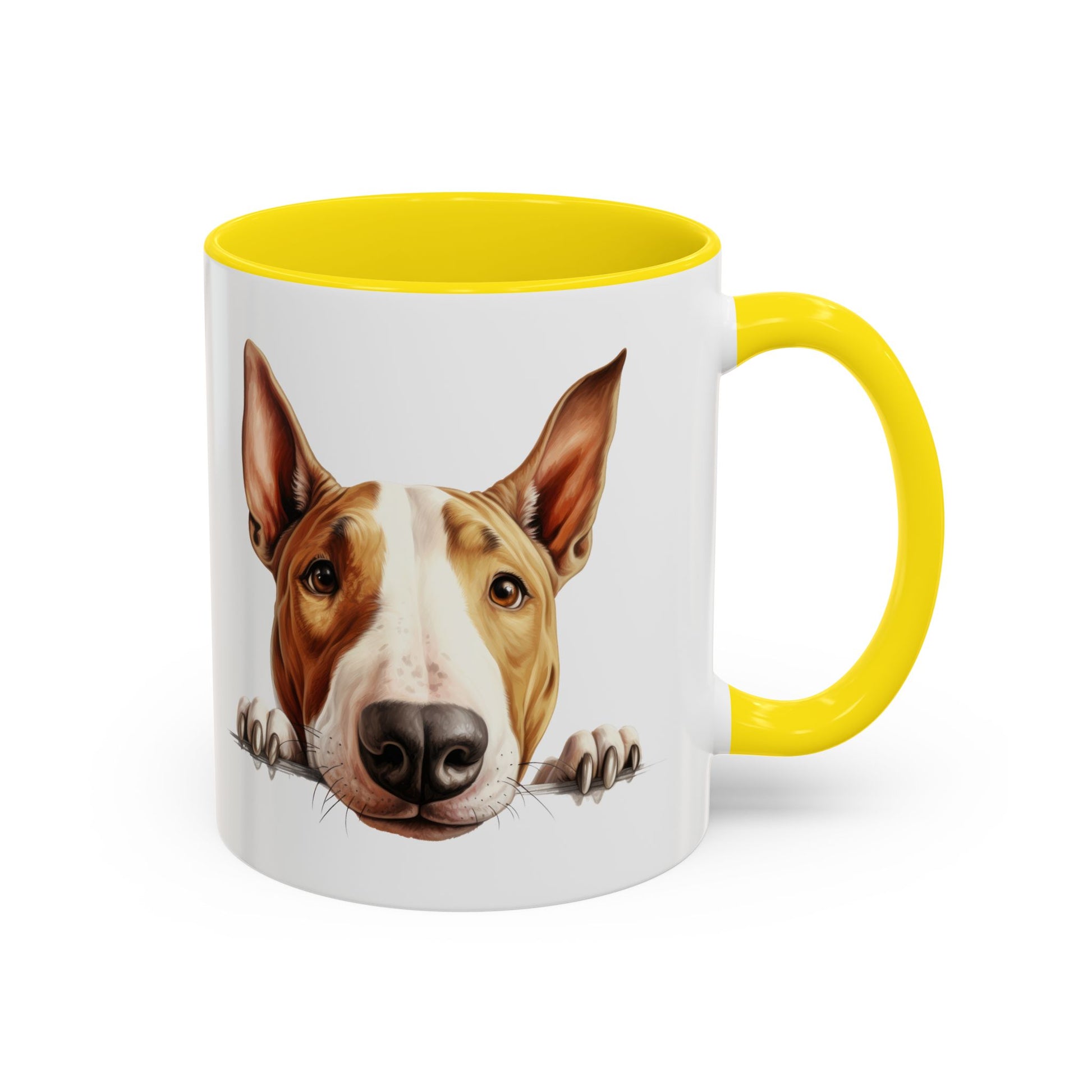 Warmth in every sip — this ceramic accent mug carries a playful, lifelike portrait of a curious bull terrier peeking over the rim. Bright, crisp printing makes every whisker and soulful eye stand out against the clean white backdrop, while the colored interior and handle add a cheerful pop. It’s the kind of mug that brings a small, honest smile to mornings, slow afternoons, and every coffee break in between. Sturdy, glossy, and low-maintenance, it’s made to be used and loved daily — whether you’re settling in for a work session, sharing stories at the kitchen table, or quietly missing a four-legged friend across the miles.