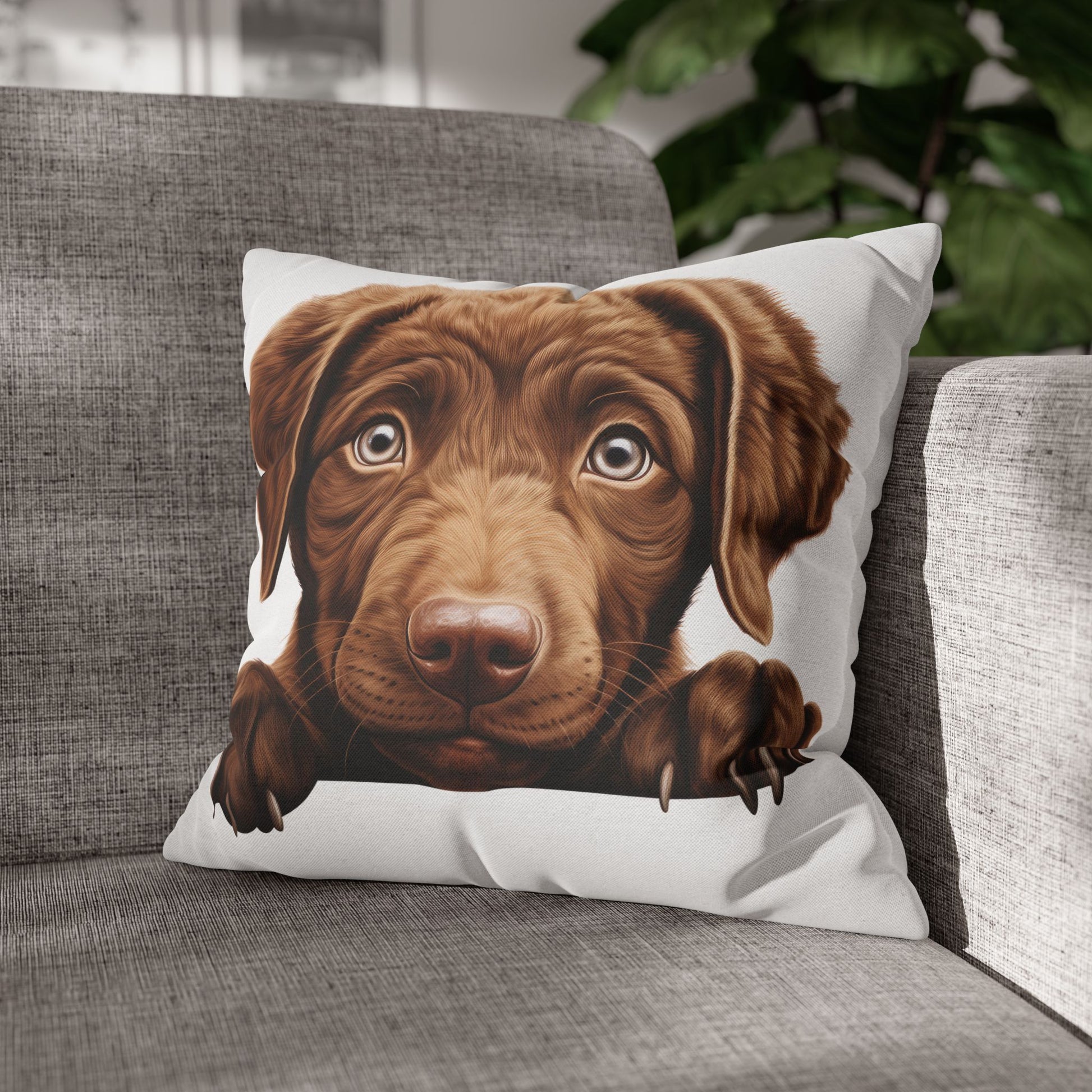 Bring warm, playful charm to your home with this square pillowcase featuring a sweet, wide-eyed chocolate lab puppy peeking over the edge. The image wraps across both sides, creating a lively focal point whether it’s placed on a sofa, reading nook, or favorite armchair. Soft spun polyester keeps the cover smooth and wrinkle-free, while a concealed beige zipper maintains a clean silhouette. It tucks neatly over your own insert (not included), adding instant personality and a cozy, pet-loving vibe to everyday spaces and laid-back gatherings.